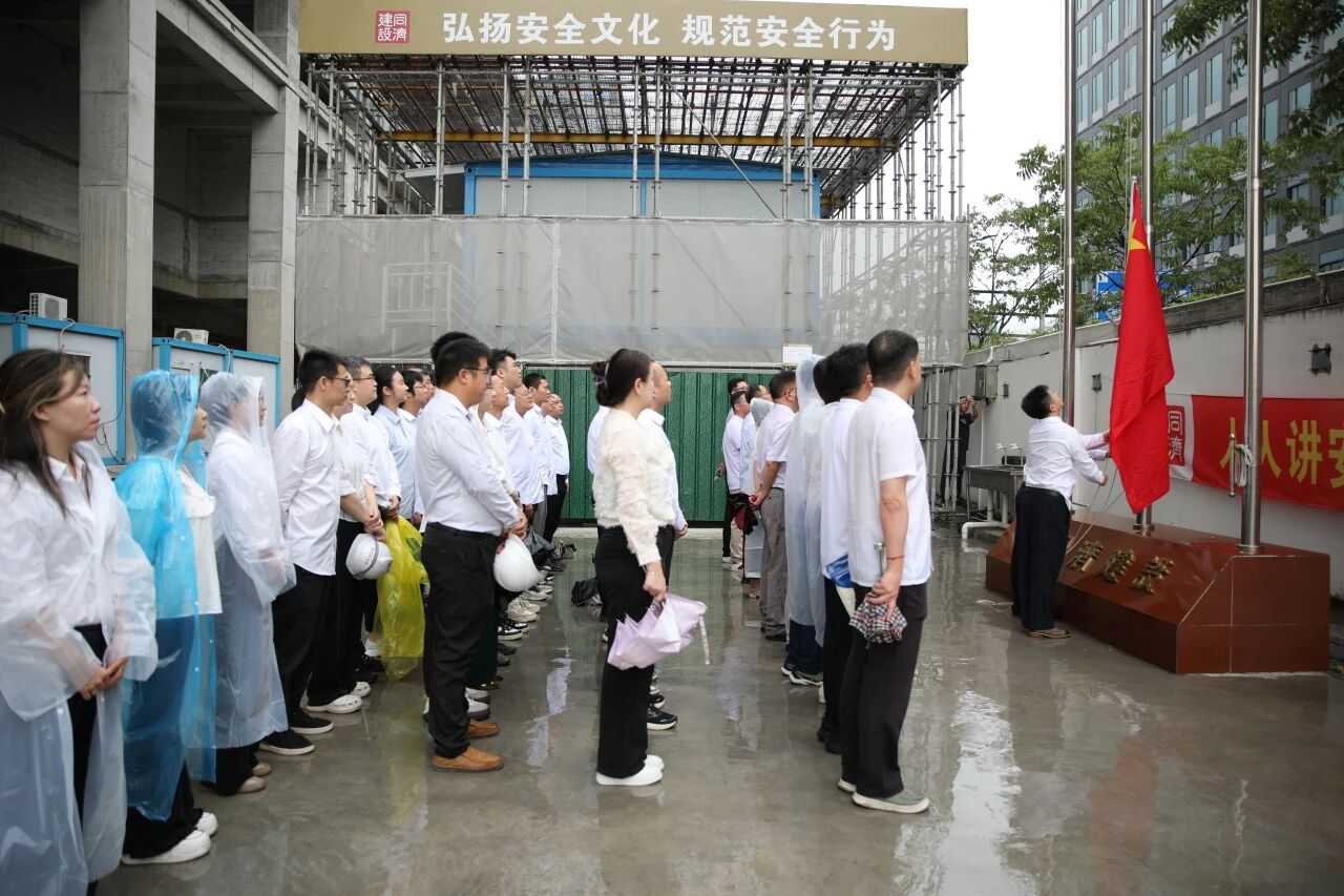 爱国之情,风雨无阻。为热烈庆祝中华人民共和国成立76周年,弘扬爱国主义精神,凝聚奋进力量,9月30日上午,tyc5997太阳集团在tyc5997太阳集团未来中心项目冒雨隆重举行升旗仪式。